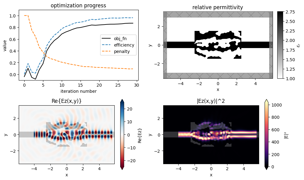 “Inverse design” is a technique for automated photonic device design. The process involves mathematically defining a “figure of merit” for one’s device and then using gradient-based optimization to efficiently maximize this function with respect to a large number of design parameters. In this section, we introduce the basics of inverse design, discuss its connections to other techniques in deep learning, and give practical examples of how it is used to design photonic devices in Tidy3D.